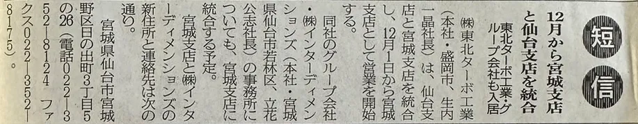 グループ会社及び宮城支店を仙台支店として移転したことを日刊建設新聞に掲載していただきました | 株式会社東北ターボ工業