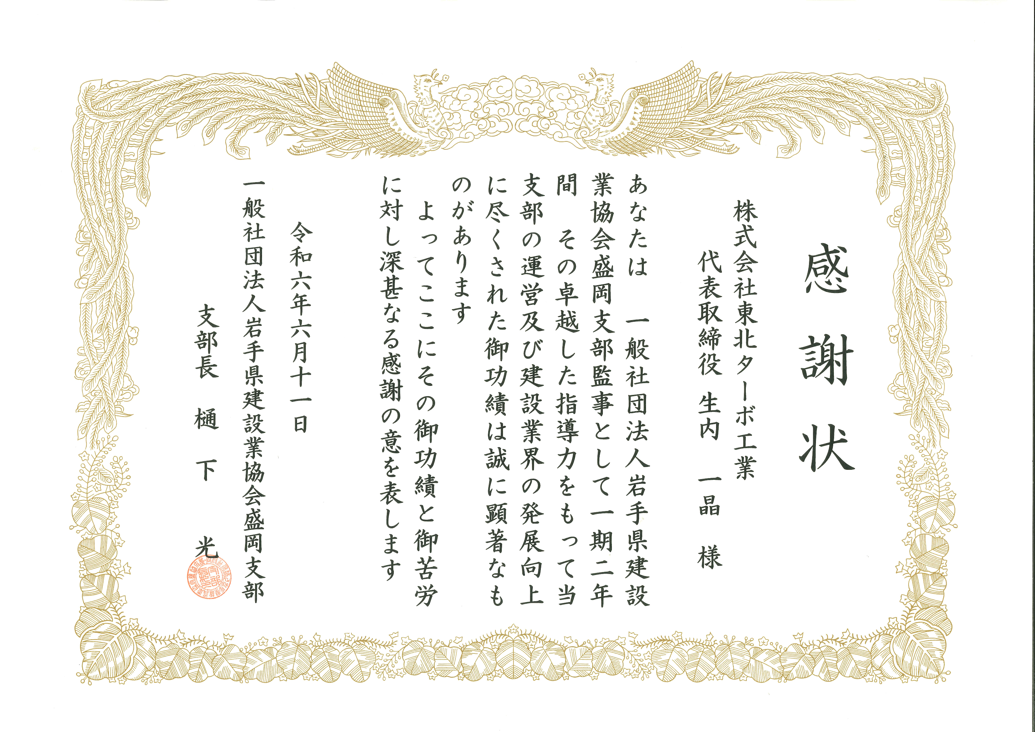 株式会社東北ターボ工業は令和6年6月11日に、一般社団法人岩手県建設業協会盛岡支部の支部監事としての活動に対し感謝状を贈呈いただきましたのでお知らせします。