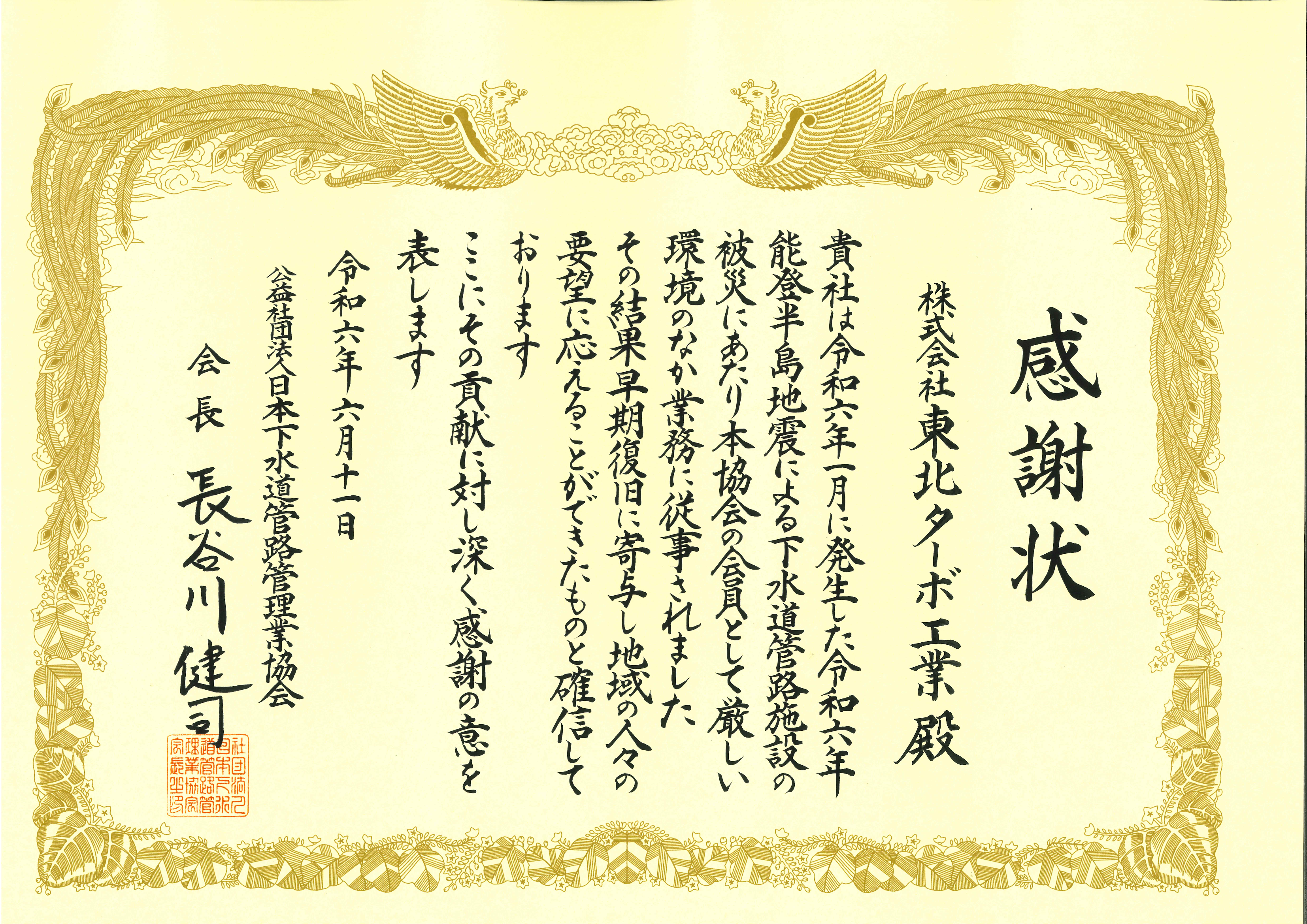 株式会社東北ターボ工業は令和6年6月11日に、公益社団法人日本下水道管路管理業協会より能登半島地震復興協力の感謝状授与のお知らせとしての活動に対し感謝状を贈呈いただきましたのでお知らせします。